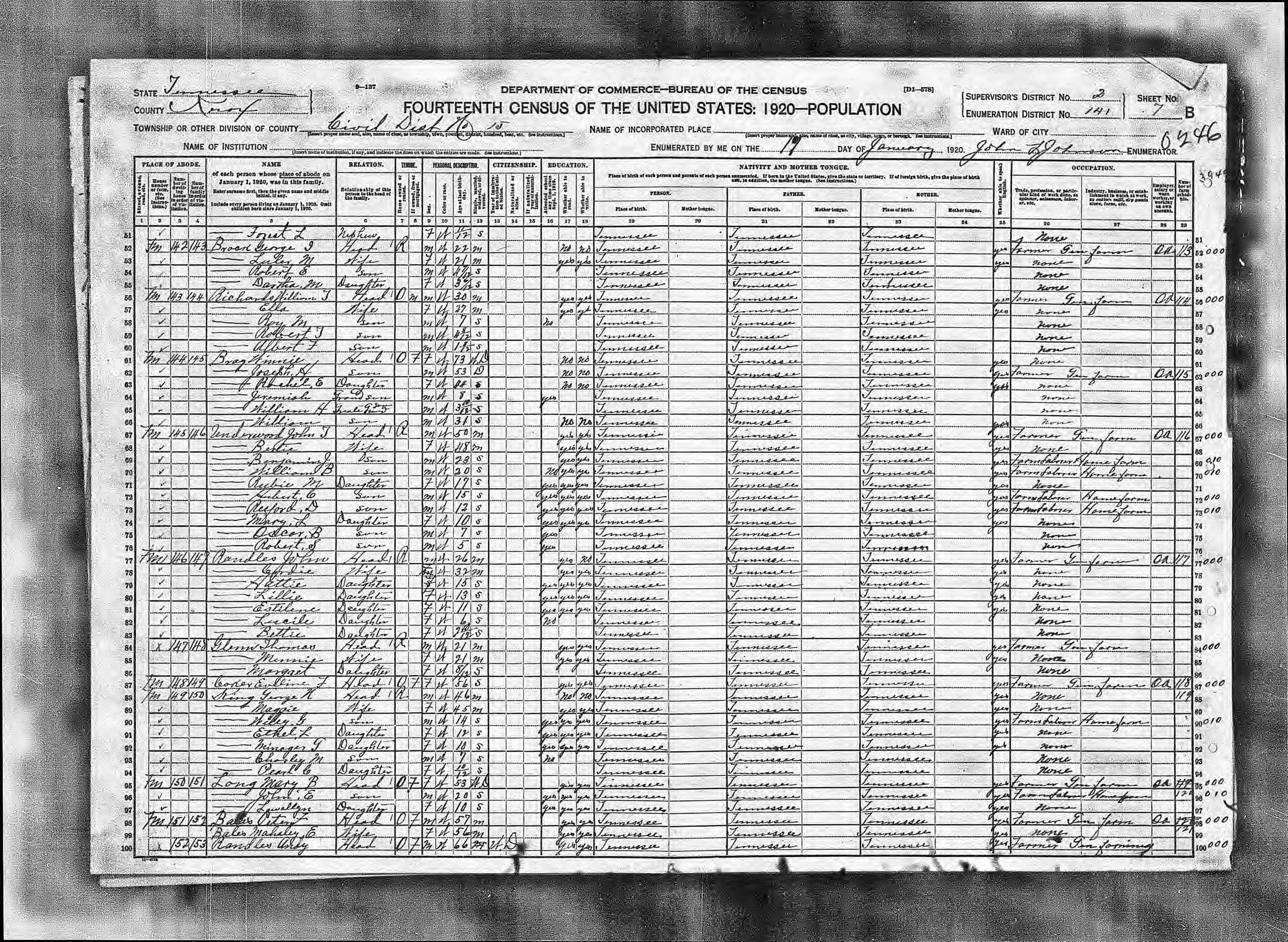 Dist. 15, Enumeration District 141, Knox County, Tennessee, 7 Jan 1920