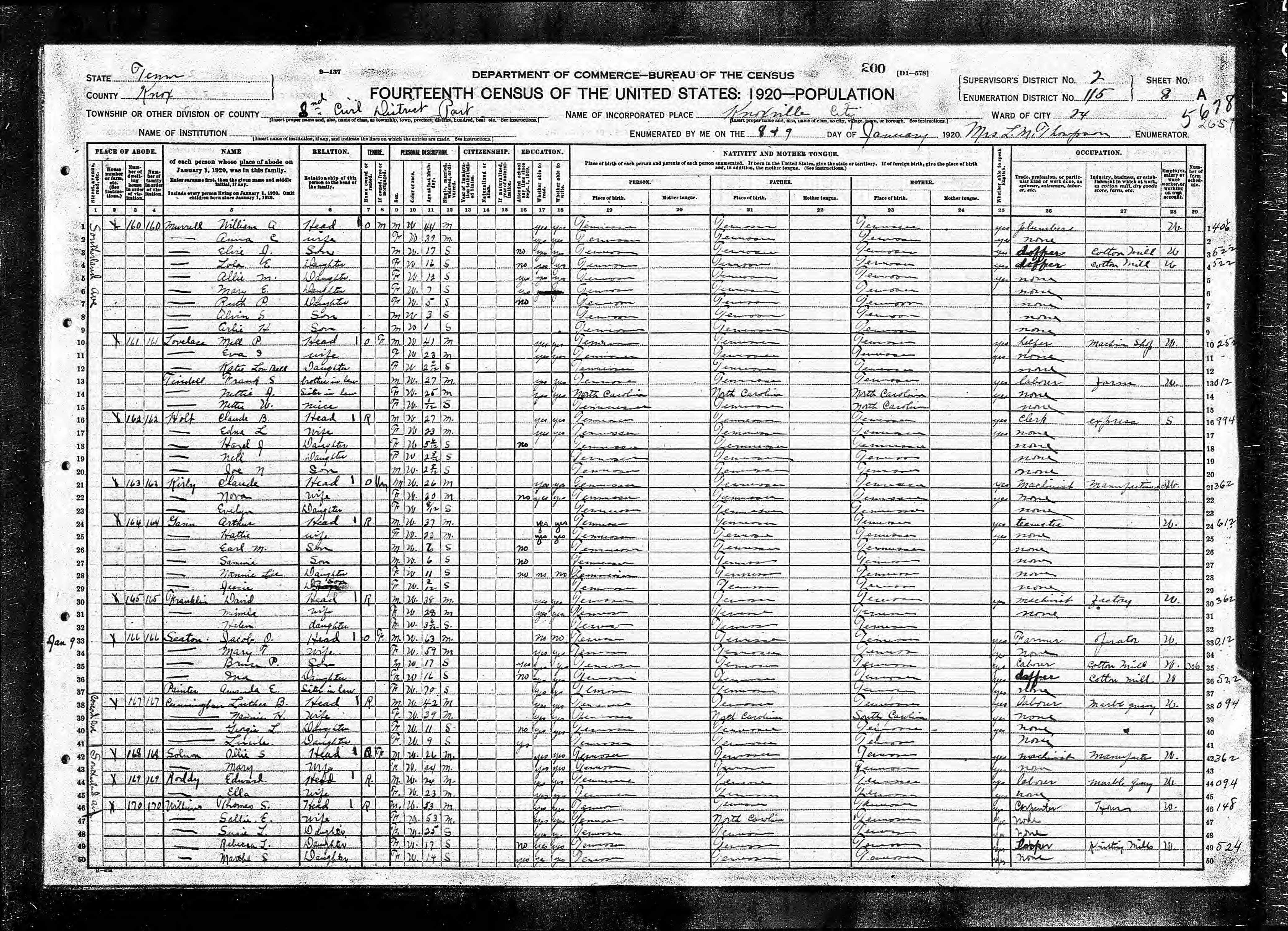 Dist. 8, Ward 24, Enumeration District 115, Knoxville City, Knox County, Tennessee, 8 & 9 Jan 1920