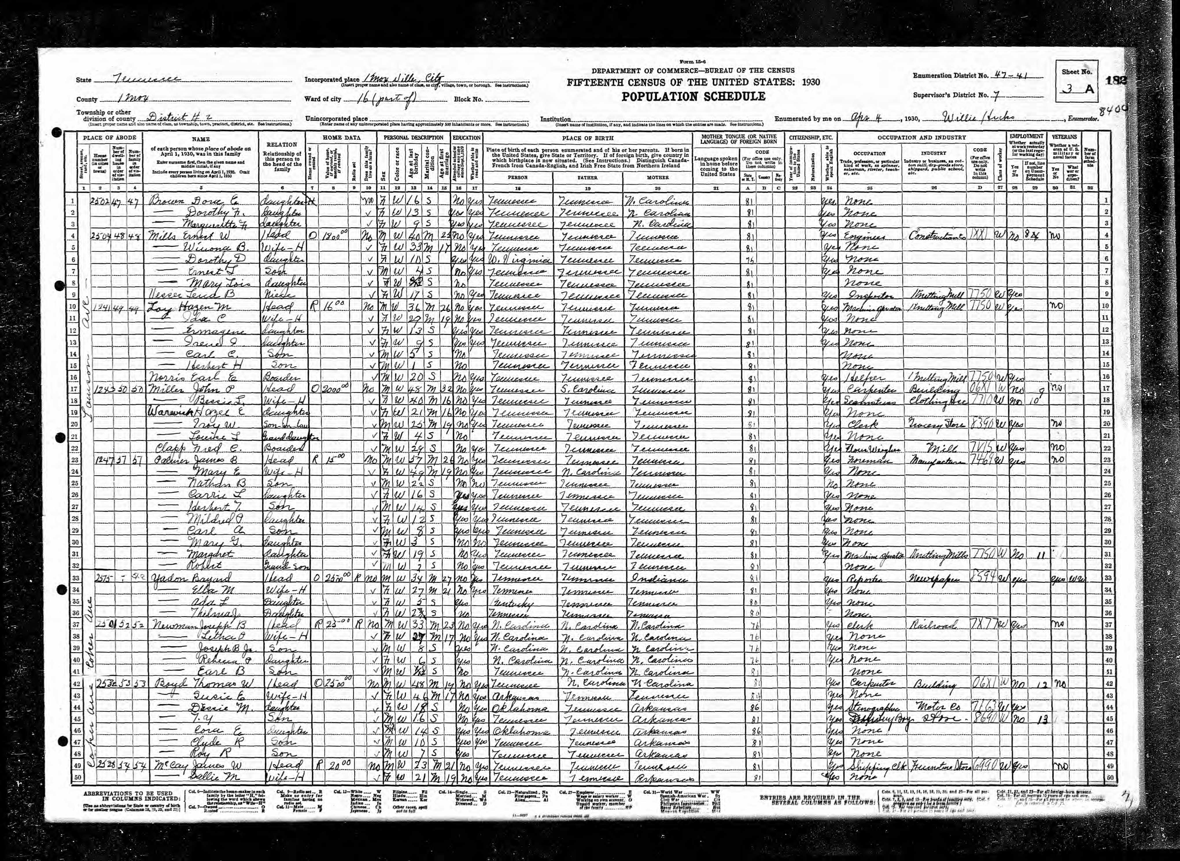 Dist. 15, Enumeration District 47-94, Knox County, Tennessee, 3 Apr 1930