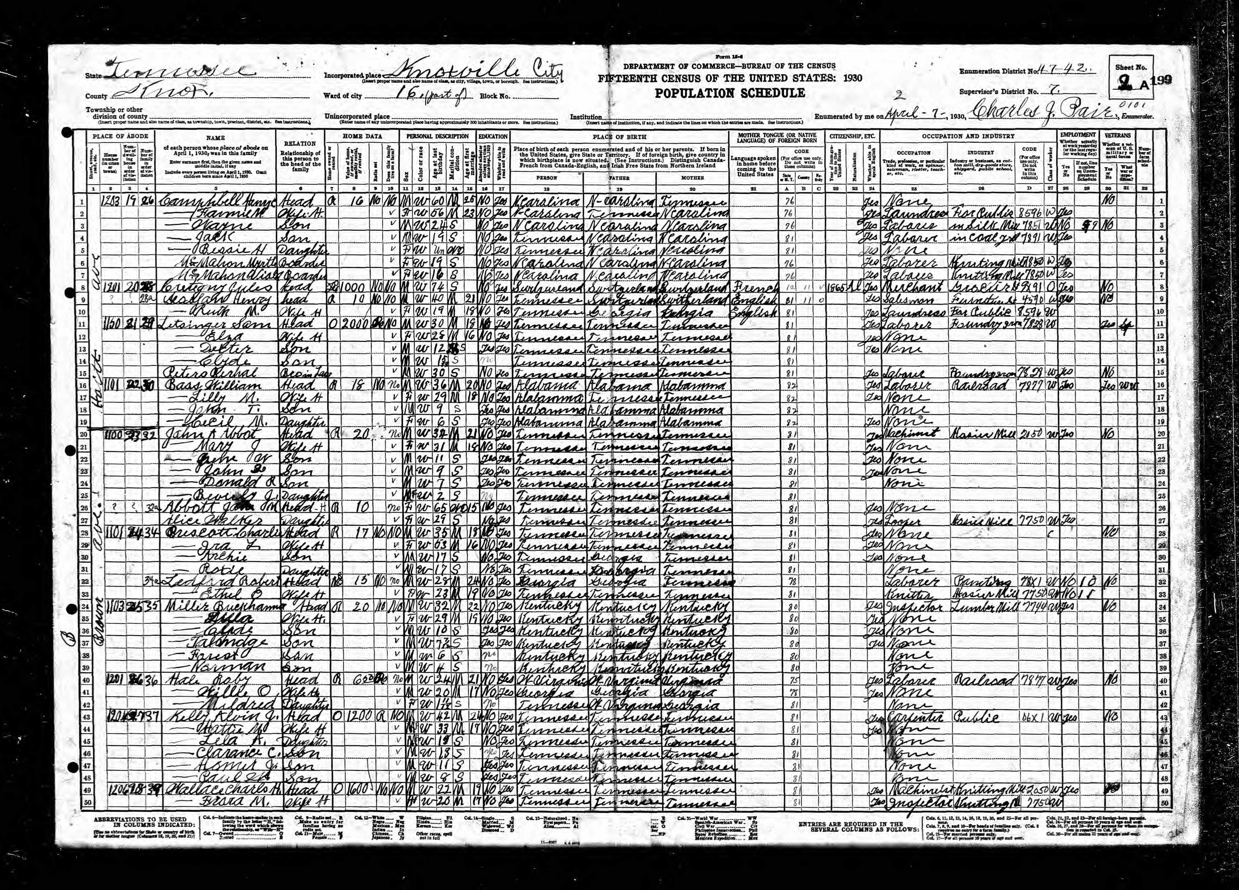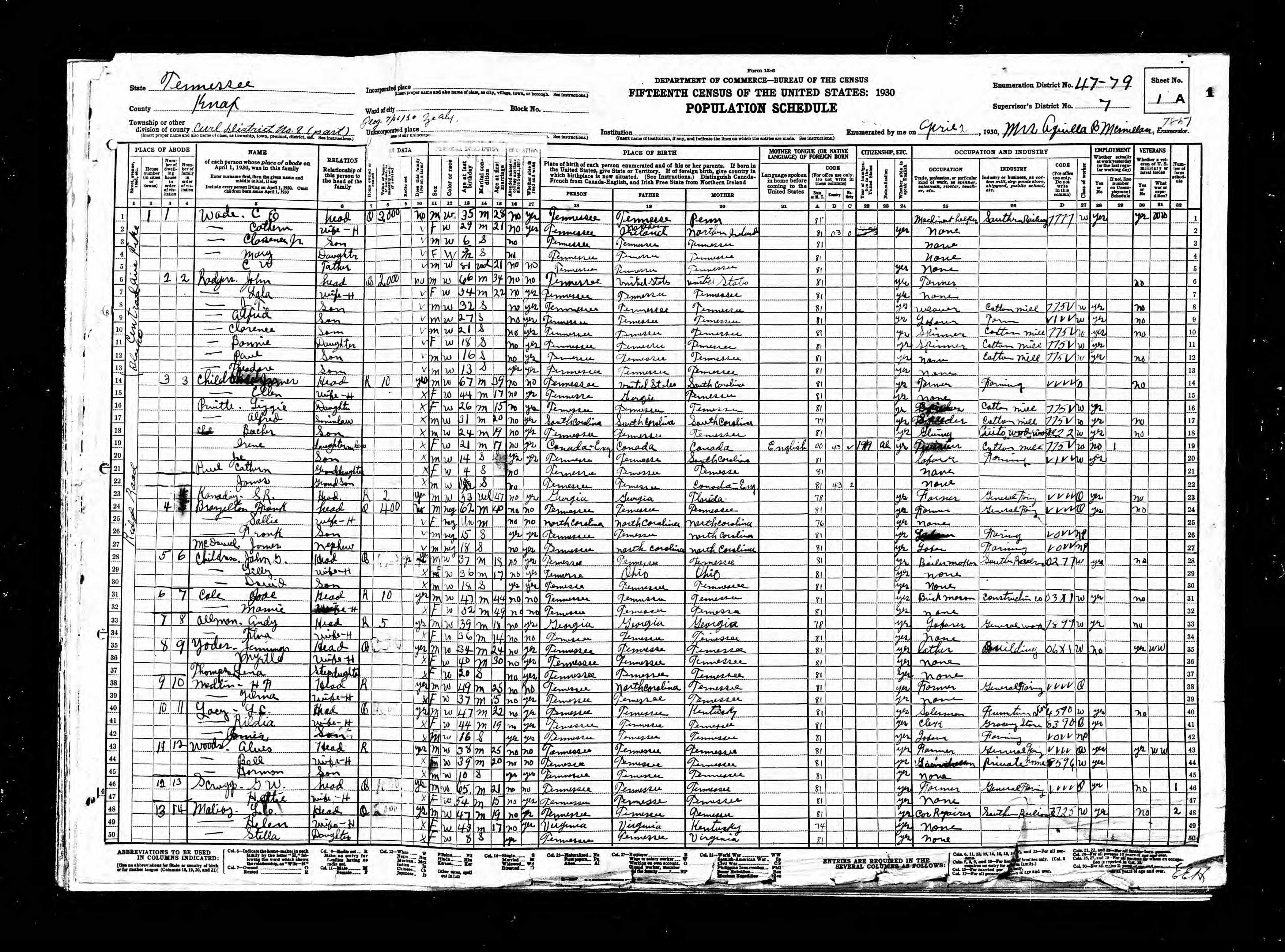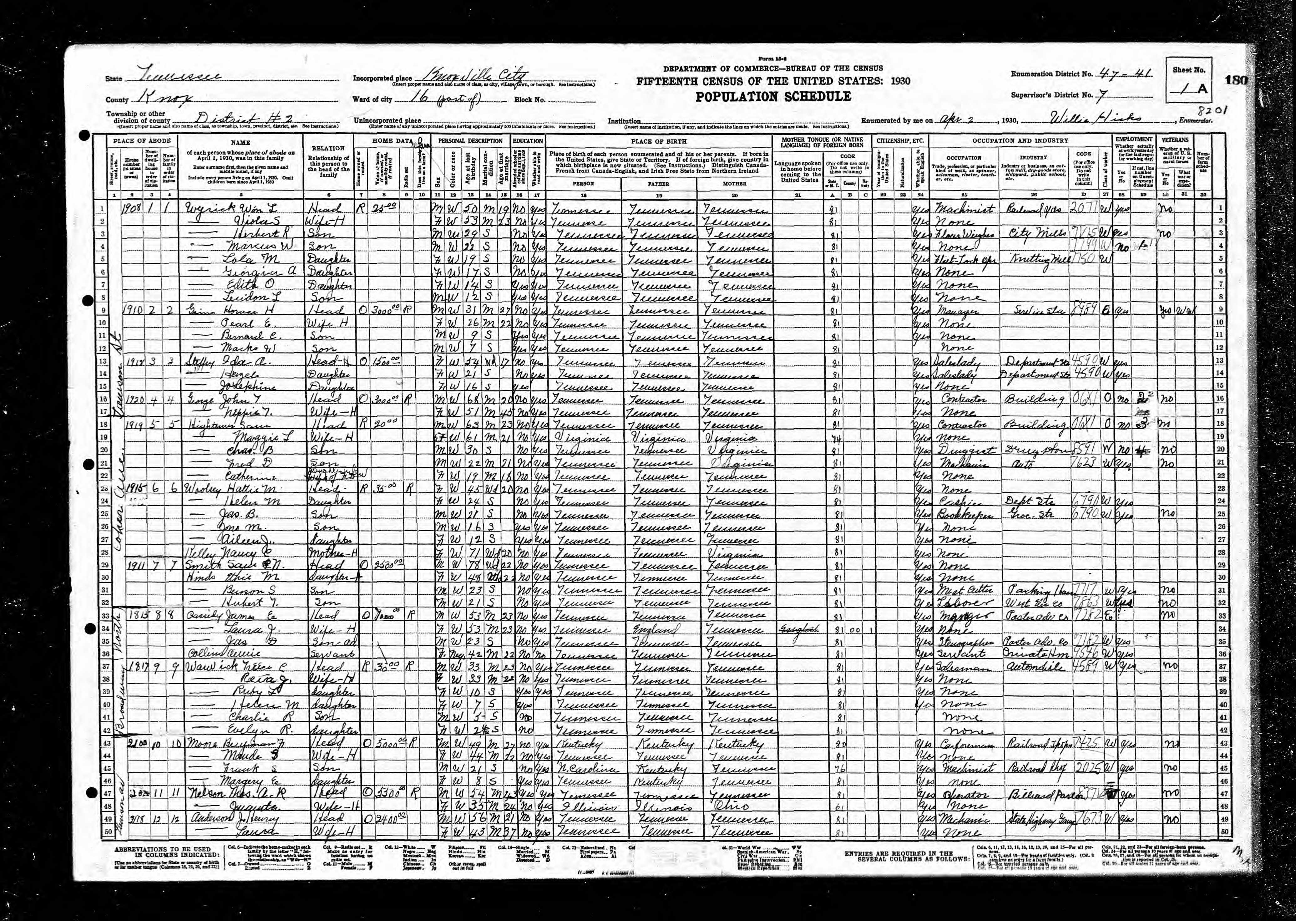 Ward 10, Enumeration District 47-27, Knoxville City, Knox County, Tennessee, 2 Apr 1930