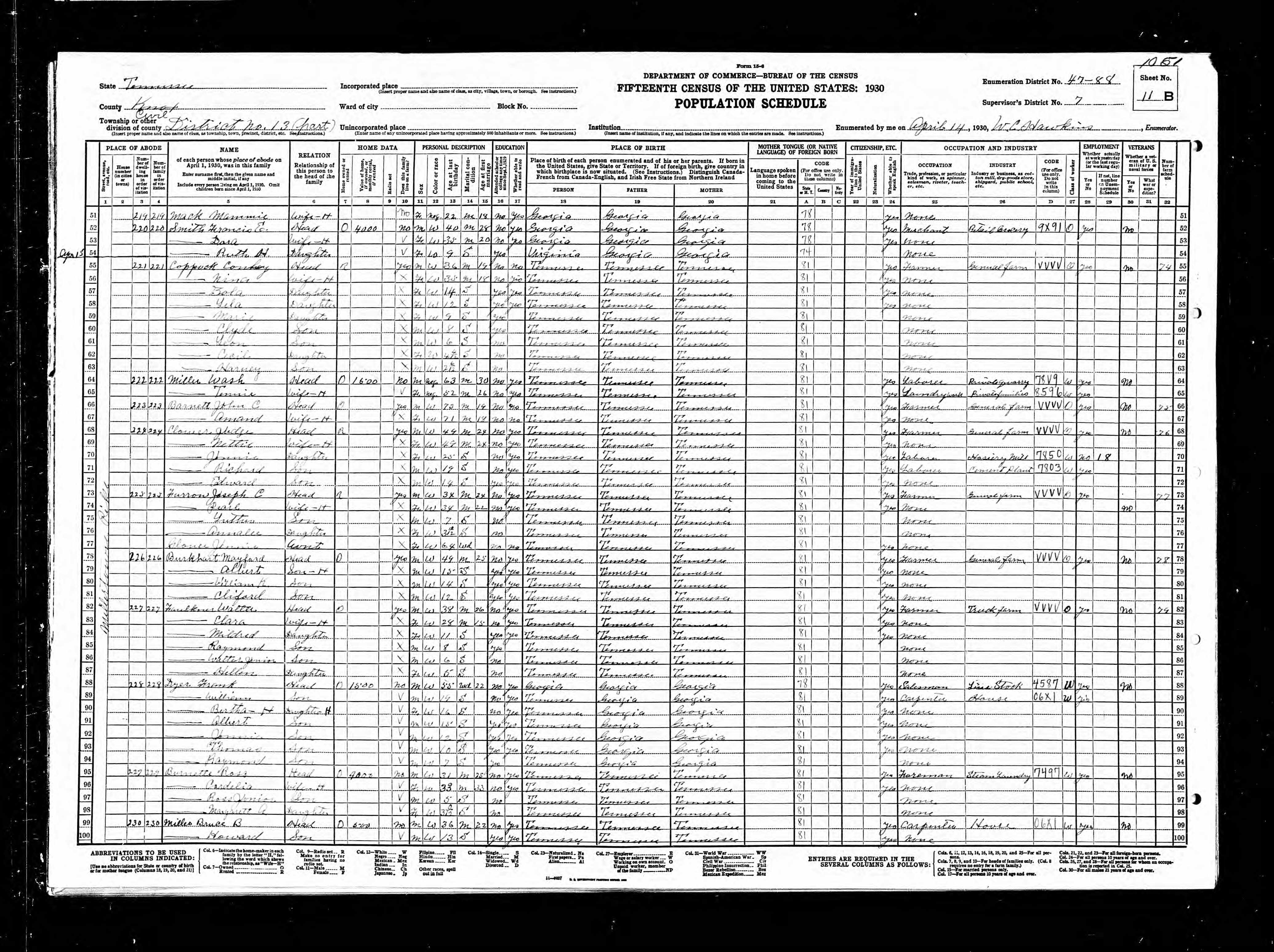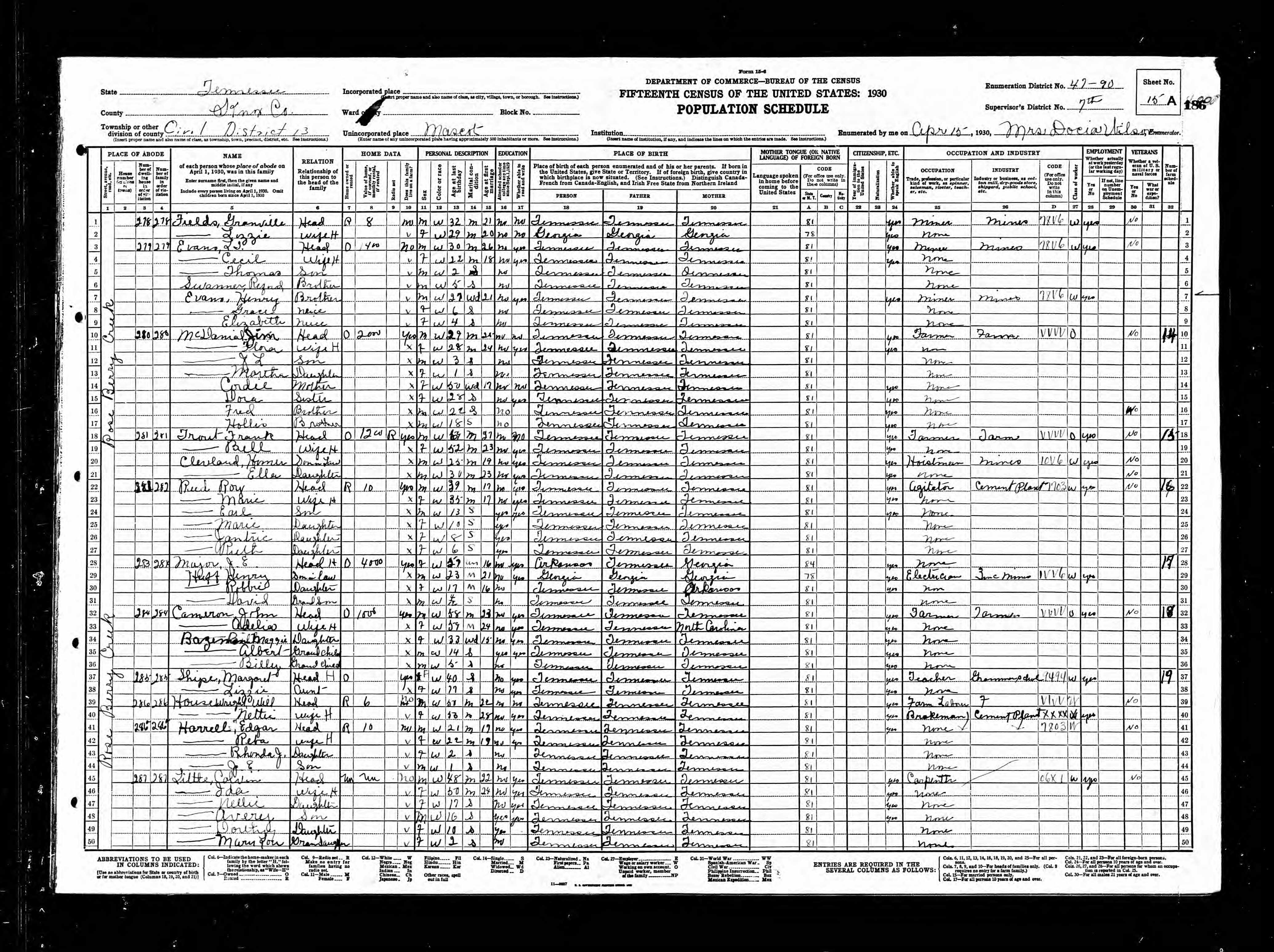 Dist. 13, Enumeration District 47-90, Mascot, Knox County, Tennessee, 15 Apr 1930