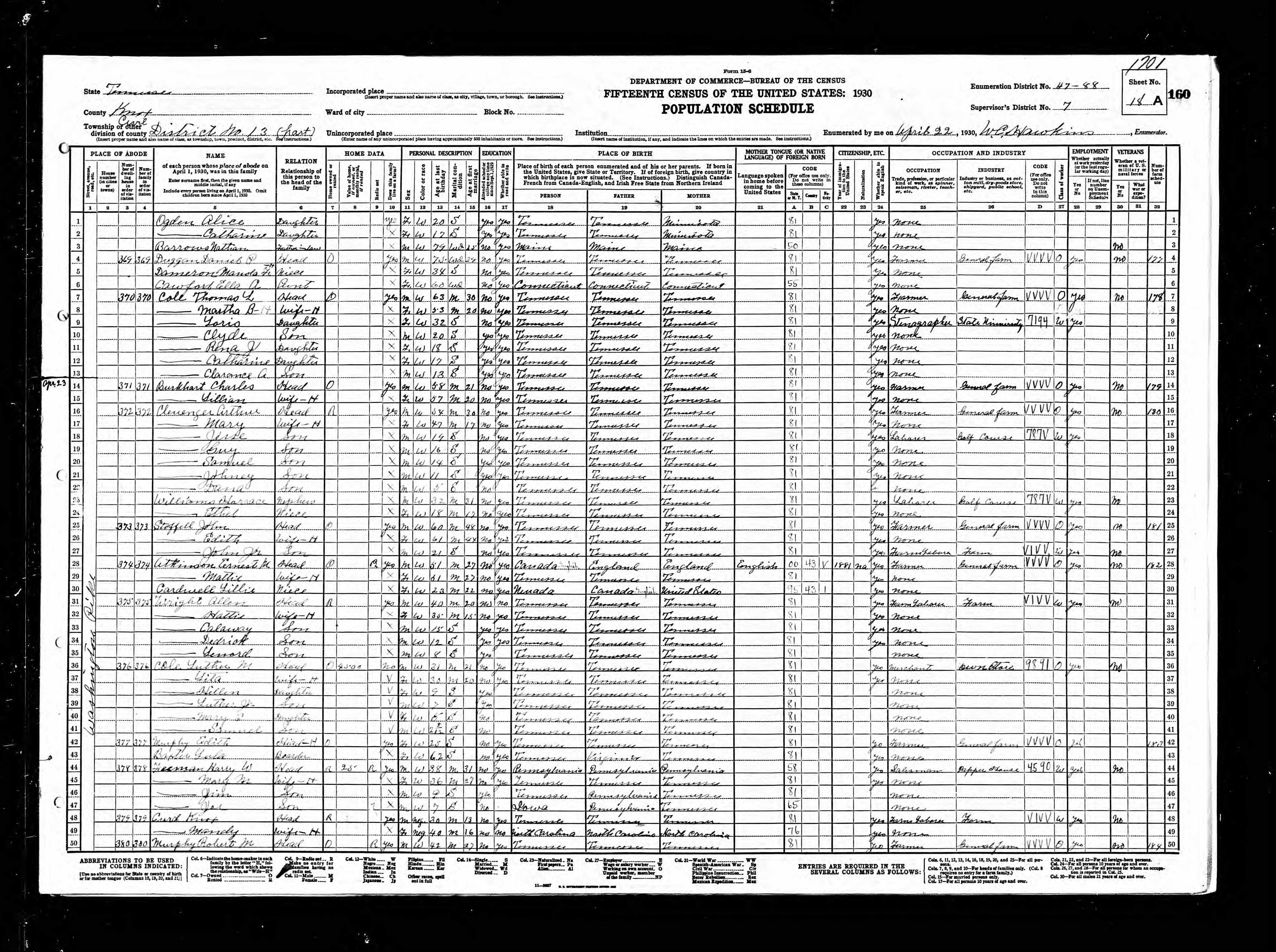 Dist. 13, Enumeration District 47-88, Knox County, Tennessee, 28 Apr 1930