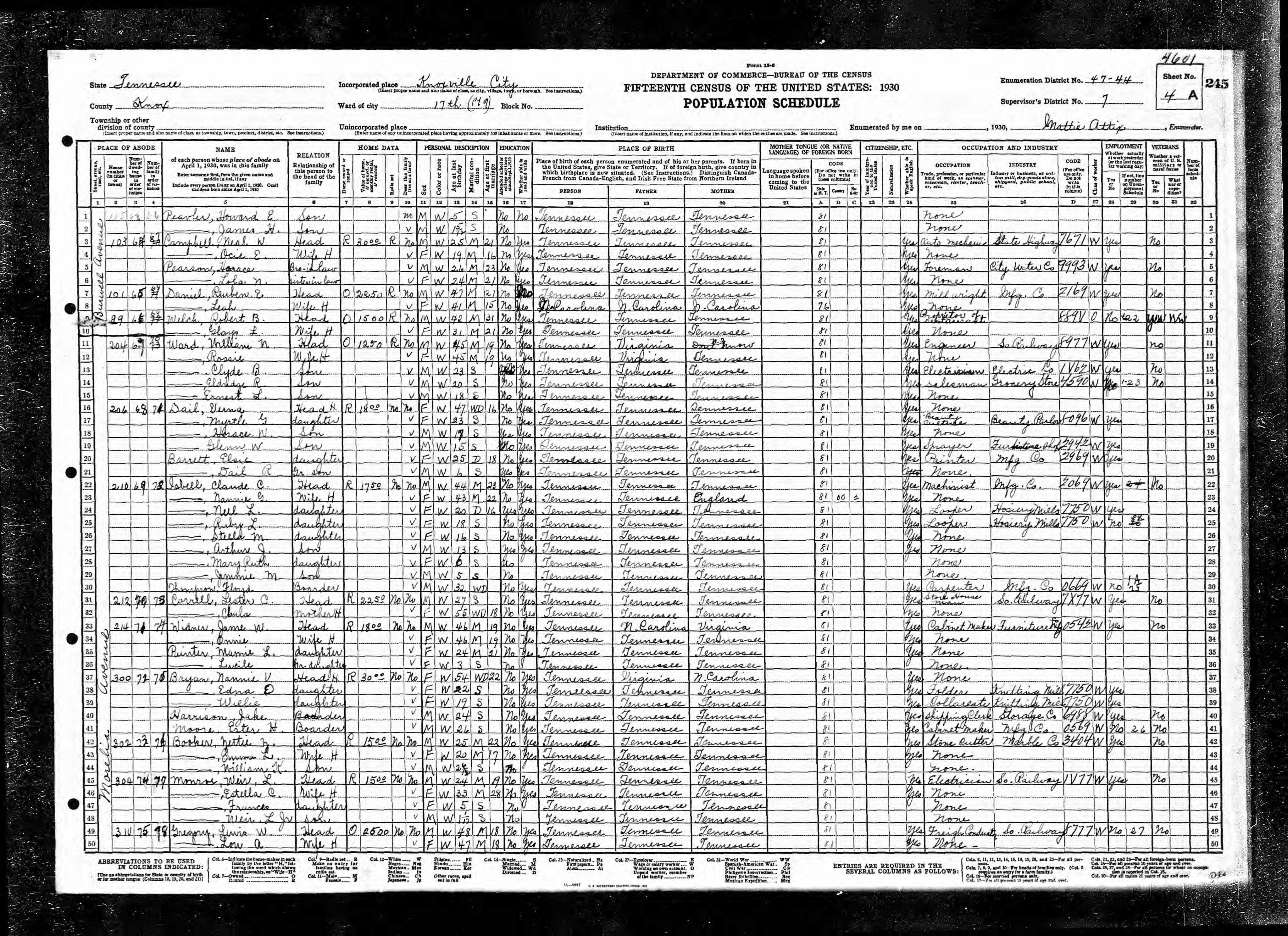 Ward 15, Enumeration District 47-37, Knoxville City, Knox County, Tennessee, 4 Apr 1930