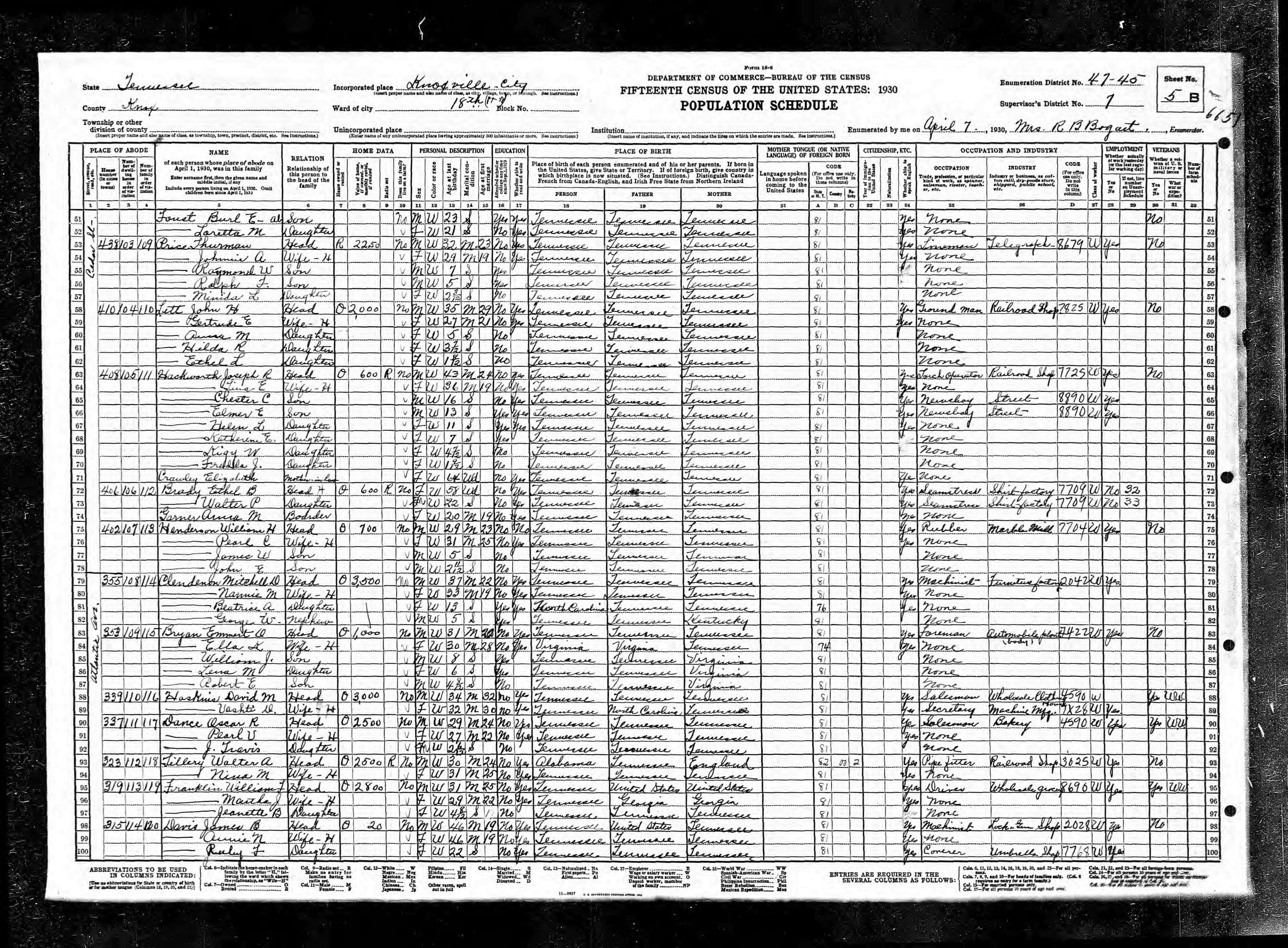 Ward 10, Enumeration District 47-20, Knoxville City, Knox County, Tennessee, 7 Apr 1930