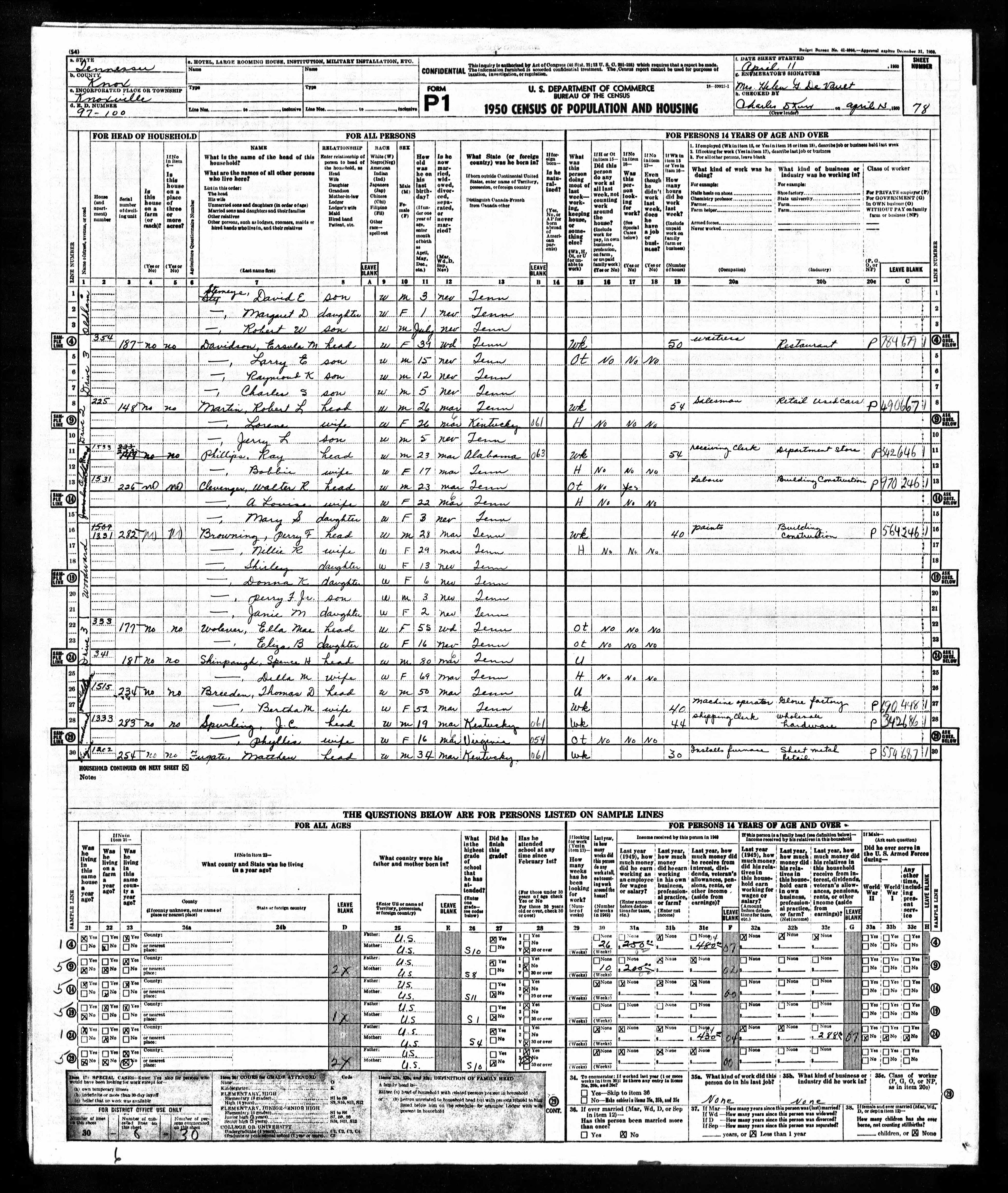 Enumeration District 96-158, Knoxville, Knox County, Tennessee, 10 Apr 1950, sheets 077 and 078