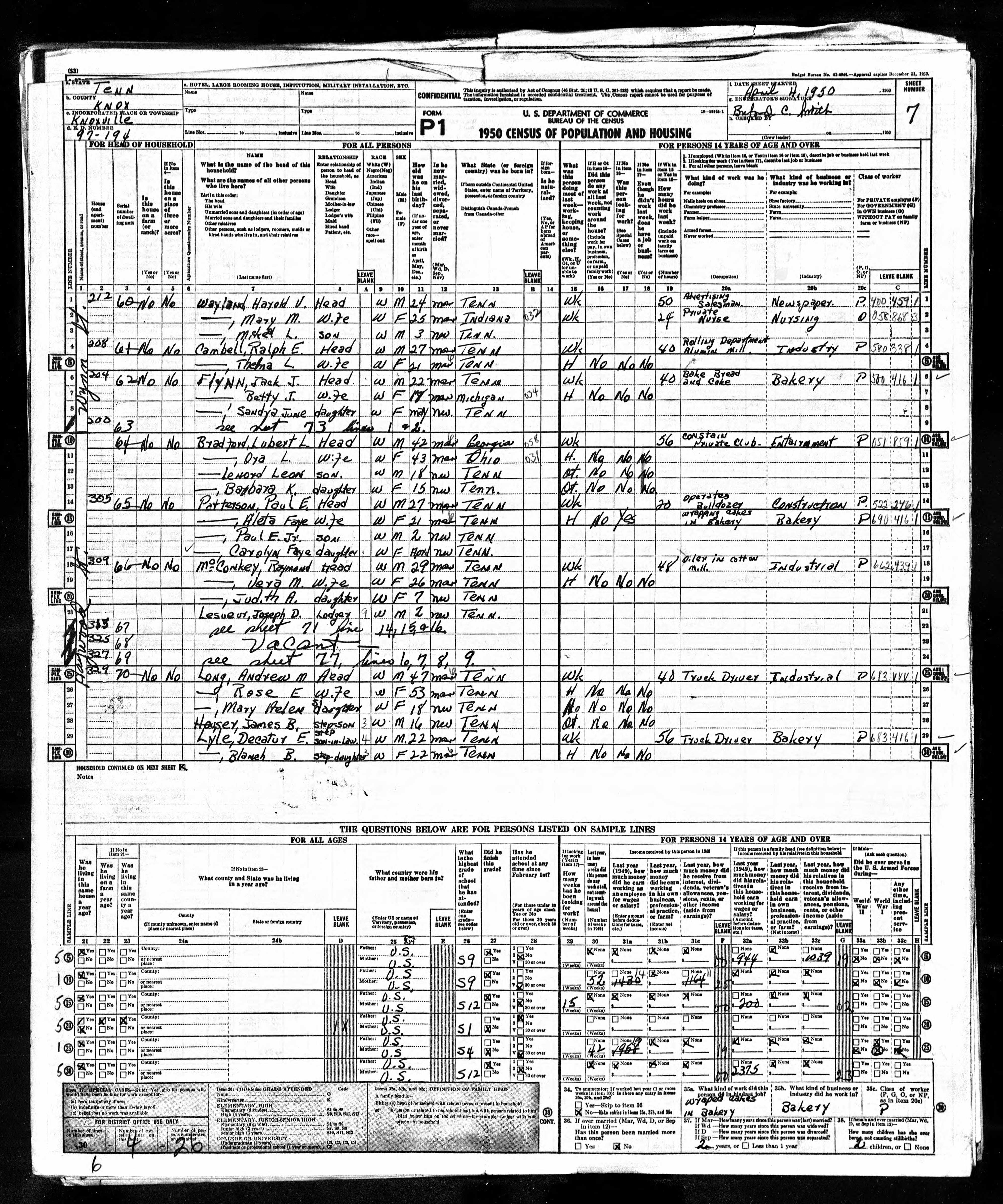1950 U.S. Census, Knox County, TennesseeEnumeration District 97-194, Knoxville, sheet 007 |