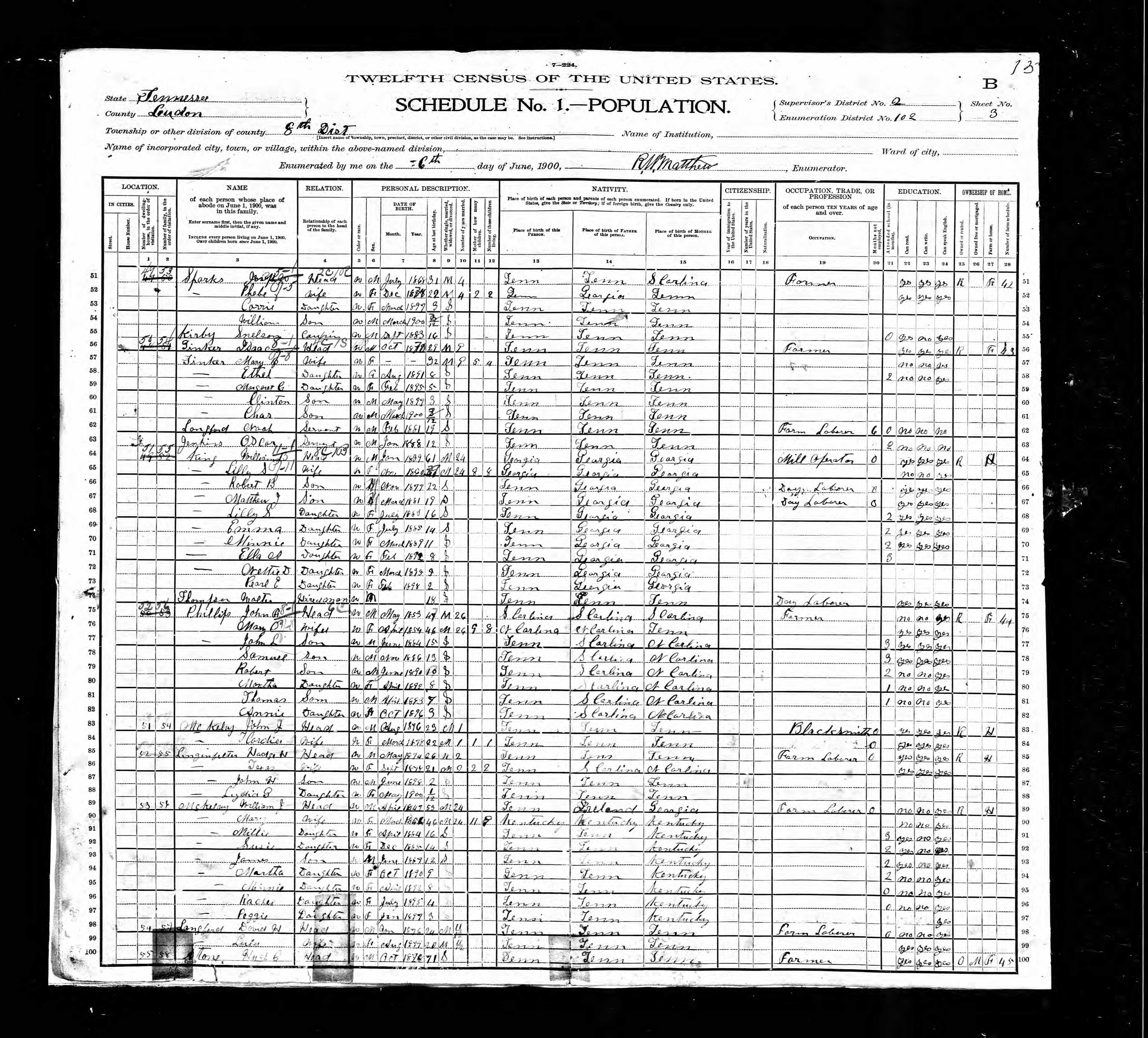 Enumeration District 102, Dist. 8, Loudon County, Tennessee, 6 Jun 1900