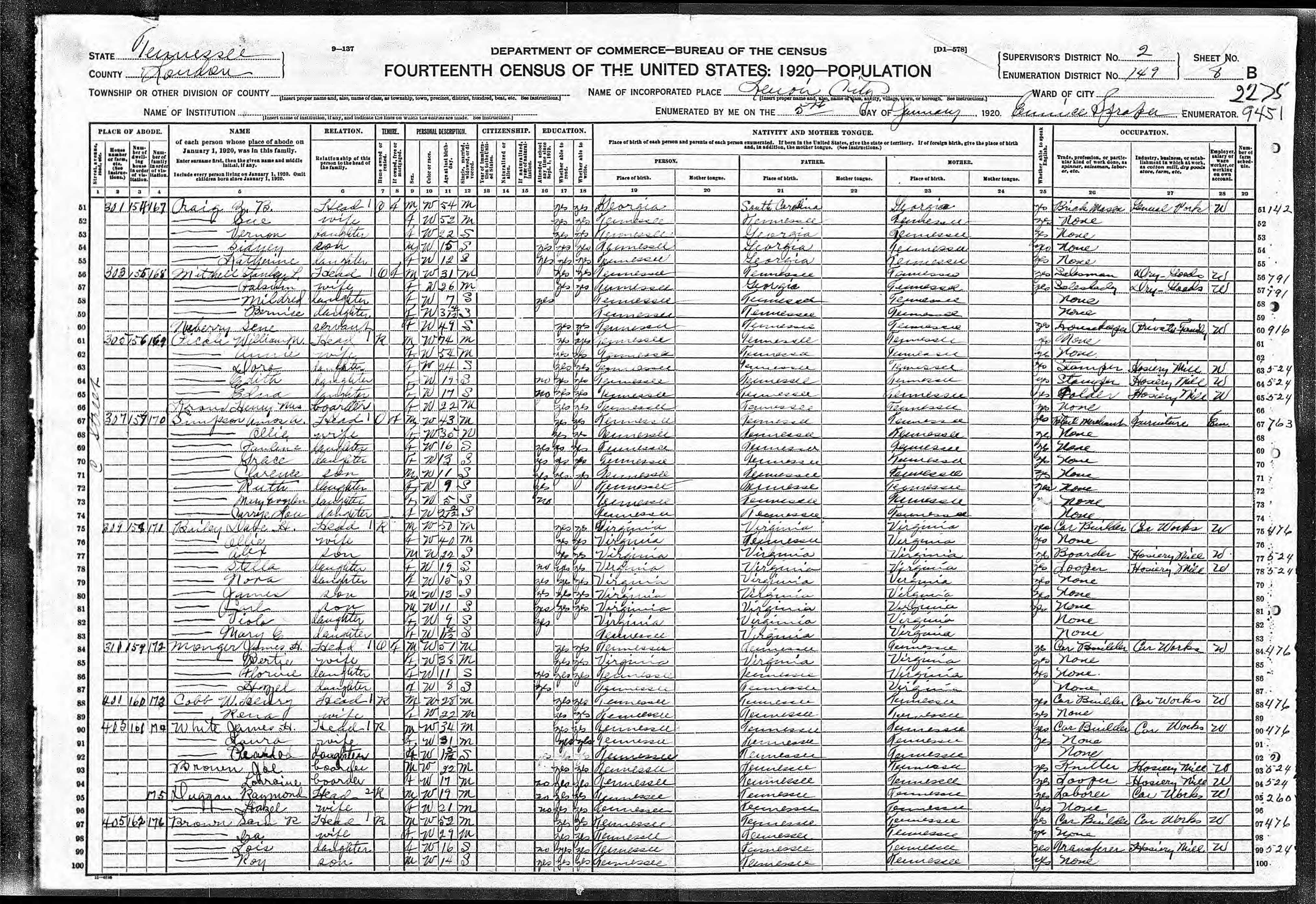 Enumeration District 149, Lenoir City, Loudon County, Tennessee, 10 Jan 1920 page 206a, 502 1st Ave, dwelling number 451, family number 477 Williamson J. A. 42 head m m w carpenter TN NC TN Margret 44 wife f m w GA GA GA Cliffie 15 dau f s w TN TN GA |