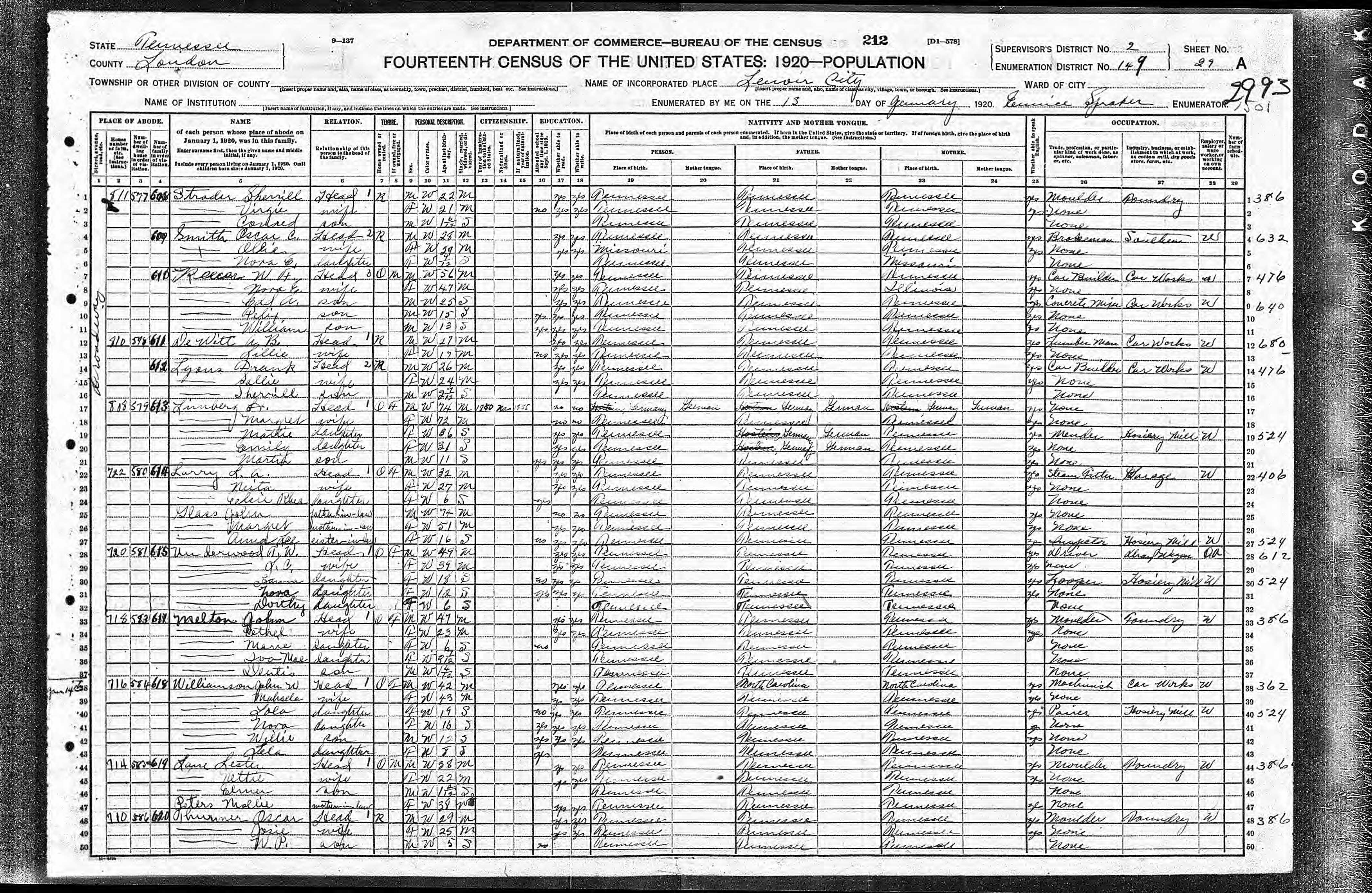 Enumeration District 149, Lenoir City, Loudon County, Tennessee, 6 Jan 1920 page 194a, 405 9th Avenue, dwelling number 206, family number 221 Williamson C. H. 32 head m m w machinist, car works TN TN TN Bessie 22 wife w m w TN TN TN page 194a, 405 9th Avenue, dwelling number 206, family number 222 Williamson A. S. 25 head m m w machinist, car works TN TN TN Myrtle 29 wife f m w TN TN TN Wayne 2 5/12 son m s w TN TN TN Frank 30 bro m s w TN TN TN |