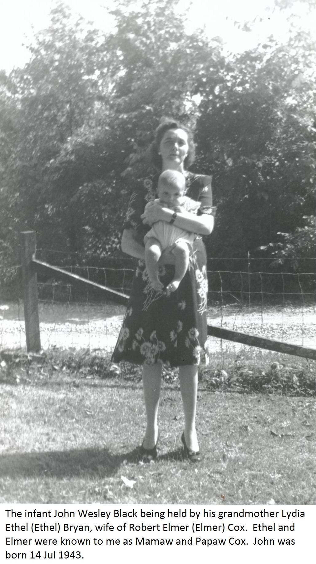 153. Lydia Ethel (Ethel) Bryan28,124,265,290,291,292 was born on 25 February 1902 in Sevier County, Tennessee.292 She was usually known as Ethel, and was called Aunt Ethel by her nieces and nephews. But she was sometimes called Lyddie. She appeared in the census in 1910 in Sevier County, Tennessee. Ethel L. 8 dau f s w TN TN TN. She appeared in the census in 1920 in Jefferson County, Tennessee. Ethel 17 wife f m w TN TN TN. Lydia appeared in the census in 1930 in Knox County, Tennessee. Ethel 28 wife f m@17 w TN TN TN. She died on 19 June 1994 at the age of 92 in Knoxville, Knox County, Tennessee.95,292 Social Security Death Index Information: Name: Lydia E. Cox; Last Residence: 37914, Knoxville, Knox County, Tennessee; Born: 25 Feb 1902; Last Benefit: 37914, Knoxville, Knox County, Tennessee; Died: Jun 1994. Obituary Knoxville News-Sentinel 21 Jun 1994, p. D6. Cox, Lydia Ethel (Polly) -- age 92, of Thorngrove community, passed away Sunday morning at Brakebill Nursing Home. Member of Huckleberry Springs United Methodist Church. Preceded in death by husband, Robert Elmer Cox. Survivors: Daughter, Kathleen Black of Knoxville; grandson and wife, John and Patricia Black of Gatlinburg; great grandchildren, Eric Black and wife, Michelle of Boulder, Colorado, Rachel Black of Knoxville; great, great, grandson, Ian Anthony Black of Colorado. Funeral service 2 p.m. Thursday, Huckleberry Springs United Methodist Church, Rev. Janice Cate, Rev. Priscilla A. Bryan officiating. Interment Mt. Zion Cemetery, Dandridge. Nephews will be pallbearers. The body will lie in state one hour before the service. Donations may be made to Huckleberry Springs United Methodist Church or Mt. Zion Cemetery Fund. The family will receive friends 7-9 p.m. Wednesday at Mynatt's. She was buried on 23 June 1994 at Mt. Zion Methodist Church Cemetery in Jefferson County, Tennessee.292 Lydia Ethel (Ethel) Bryan and Robert Elmer (Elmer) Cox were married on 10 August 1919 in Jefferson County, Tennessee.15 Robert Elmer (Elmer) Cox28,124,292,293, son of James Harmon Cox and Ola Maud Cline, was born on 14 March 1901 in Jefferson County, Tennessee.293 He appeared in the census in 1910 in Jefferson County, Tennessee. Elmer Robert 9 son m s w 9 TN TN TN can R/W, attended school. He appeared in the census in 1920 in Jefferson County, Tennessee. Strawberry Plains Village, Dist. 6, Jefferson County, Tennessee, 7th - 8th - 9th Jan 1920; p.120a, River Bend Road, dwelling number 22, family number 22; Cox Elmer 18 head m m w farm laborer TN TN TN; Ethel 17 wife f m w TN TN TN. Robert appeared in the census in 1930 in Knox County, Tennessee. Dist. 15, Enumeration Distict 47-94, Knox County, Tennessee, 16 Apr 1930; p.257b, Grant Road, dwelling number 184, family number 187; Cox R. Elmer 29 head m m@18 w laborer, hwy dept., rents $6/month TN TN TN; Ethel 28 wife f m@17 w TN TN TN; C. Kathleen 9 dau f s w TN TN TN. He died on 12 November 1981 at the age of 80 in Knoxville, Knox County, Tennessee.293 Social Security Death Index Information: Name: Robert Cox; Last Residence: 37914, Knoxville, Knox County, Tennessee; Born: 14 Mar 1901; Last Benefit: 37914, Knoxville, Knox County, Tennessee; Died: Nov 1981. He was buried about 14 November 1981 at Mt. Zion Methodist Church Cemetery in Jefferson County, Tennessee. The church is also known as Goose Creek. Lydia Ethel (Ethel) Bryan and Robert Elmer (Elmer) Cox had the following children: +292 | i. | Clara Kathleen (Kathleen) Cox28,95,292,294,295 was born on 26 October 1920 in [Knox County], Tennessee.95 She appeared in the census in 1930 in Knox County, Tennessee. C. Kathleen 9 dau f s w TN TN TN. She died on 4 March 2006 at the age of 85 in Ft. Sanders Regional Medical Center, Knoxville, Knox County, Tennessee.95,294 Obituary, Knoxville News-Sentinel, 6 Mar 2006. BLACK, KATHLEEN (KATHY) - Age 85 of Knoxville died peacefully March 4, 2006 at Ft. Sanders Regional Medical Center. Kathy was a longtime member of First Baptist Church of Knoxville, the Ladies Auxiliary of the Knoxville Academy of Medicine. She was preceded in death by: her husband; Dr. Charles Black; and parents, Elmer and Ethel Cox. She is survived by: her son and daughter-in-law, John and Patricia Black; grandchildren, Eric and Rachel Black; great grandchildren, Ian and Wolfgang Black. Funeral service 7:00 p.m. Monday at Rose Mortuary Mann Heritage Chapel with Rev. Dave Ward and Dr. William D. Shiell officiating. Family and friends will meet at Highland Memorial Cemetery by 12:45 pm Tuesday for a 1:00 p.m. interment service. The family will receive friends 5:00-7:00 Monday at Rose Mortuary Mann Heritage Chapel. www.rosemortuary.com Social Security Death Index Information: Name: Kathleen C. Black; Last Residence: 37862 Sevierville, Sevier County, Tennessee; Born: 26 Oct 1920; Died: 4 Mar 2006; State (Year) SSN issued: Tennessee (Before 1951). Clara was buried on 7 March 2006 in Highland Memorial Cemetery, Knoxville, Knox County, Tennessee.294 |